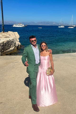 “When Gemma Sort Chilvers first tried on her wedding dress from The Own Studio, she immediately fell in love with the minimalist silhouette. “It was elegant, had an ease to it, but [was] still bridal,” she recalls of trying on the drop-waist silk gown, featuring a full skirt and train.”