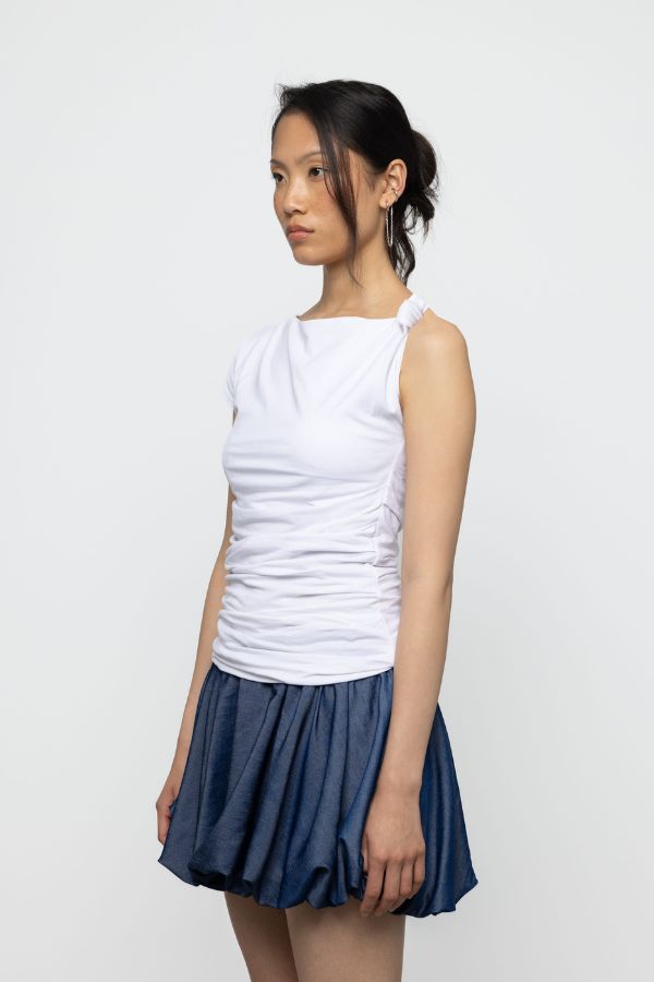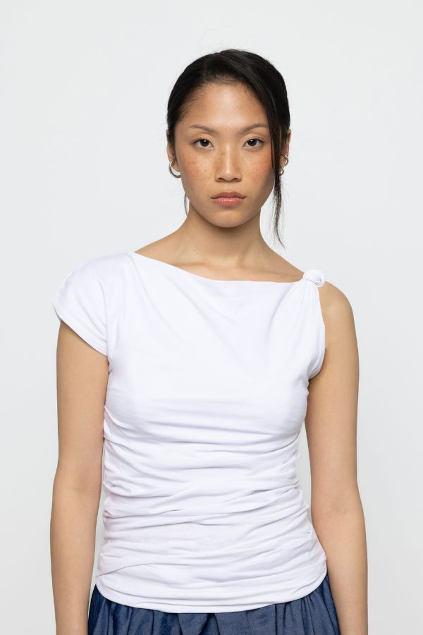 Show a little shoulder. The Asymmetric Knot Jersey Top from Ésthe is boatneck, one shoulder top made in a semi stretched fabric.