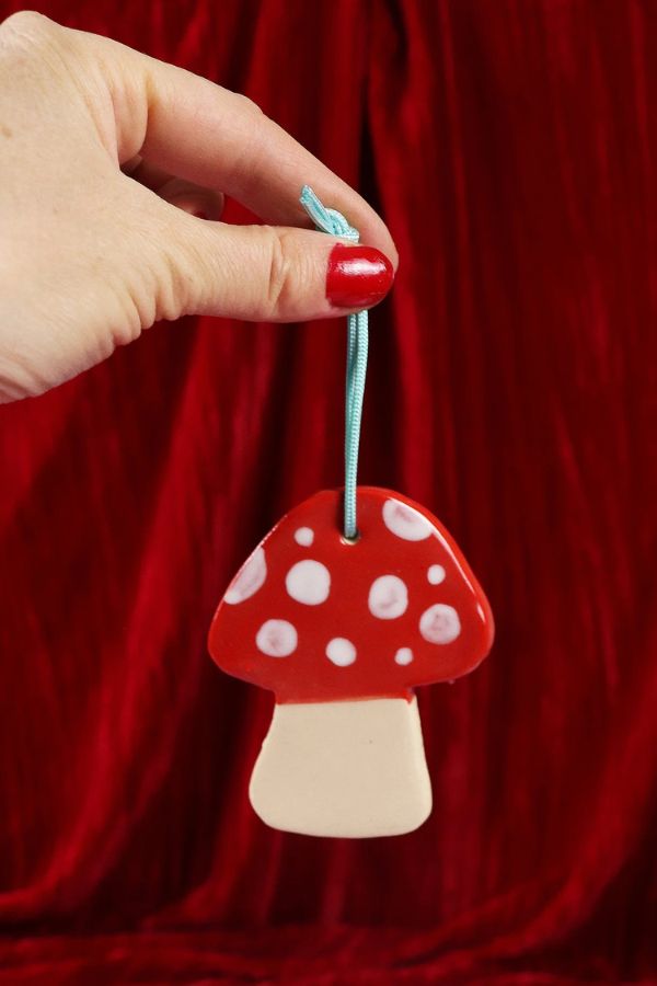 Add a bit of whimsy and fun to your holiday decor with our hand built and individually painted mushroom ornament.