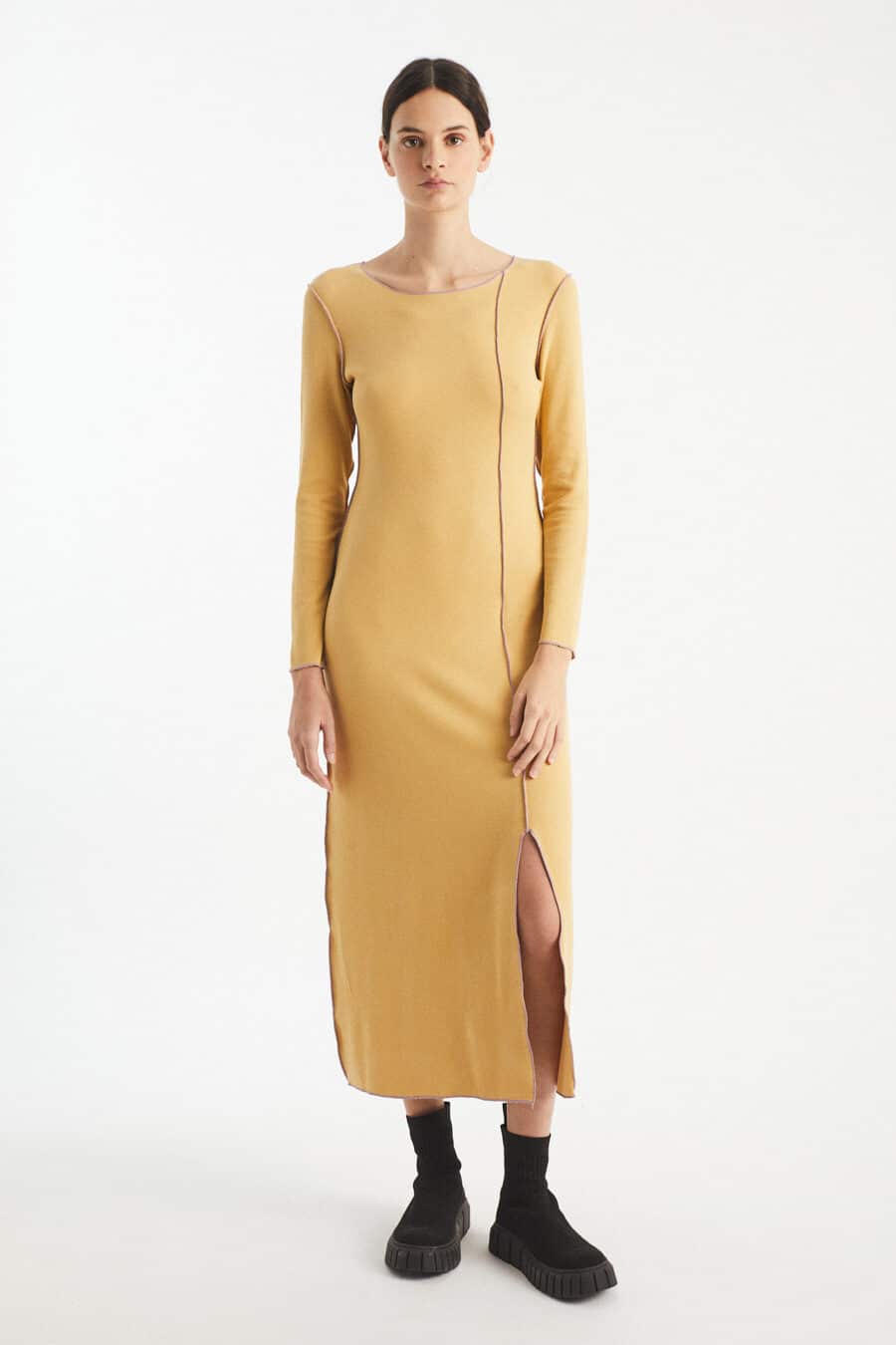 Knit fitted dress with vertical cut.