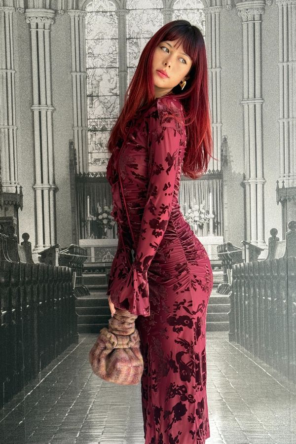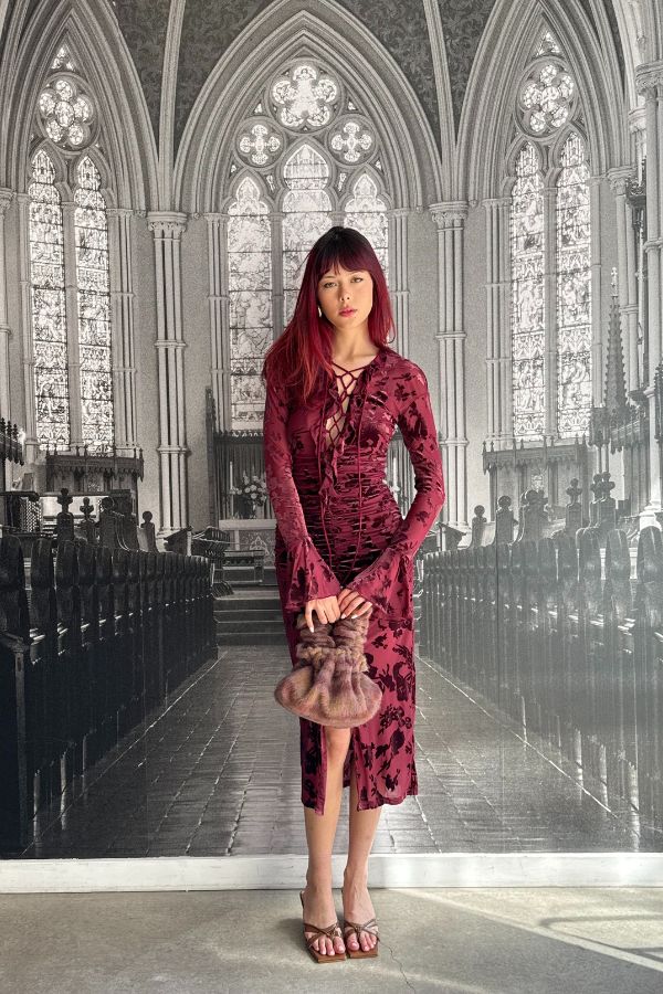 Fitted mesh dress with flocked floral velvet, deep v-neck and string closure. Gathers along the sides and slit at the centre front. Removable slip dress.