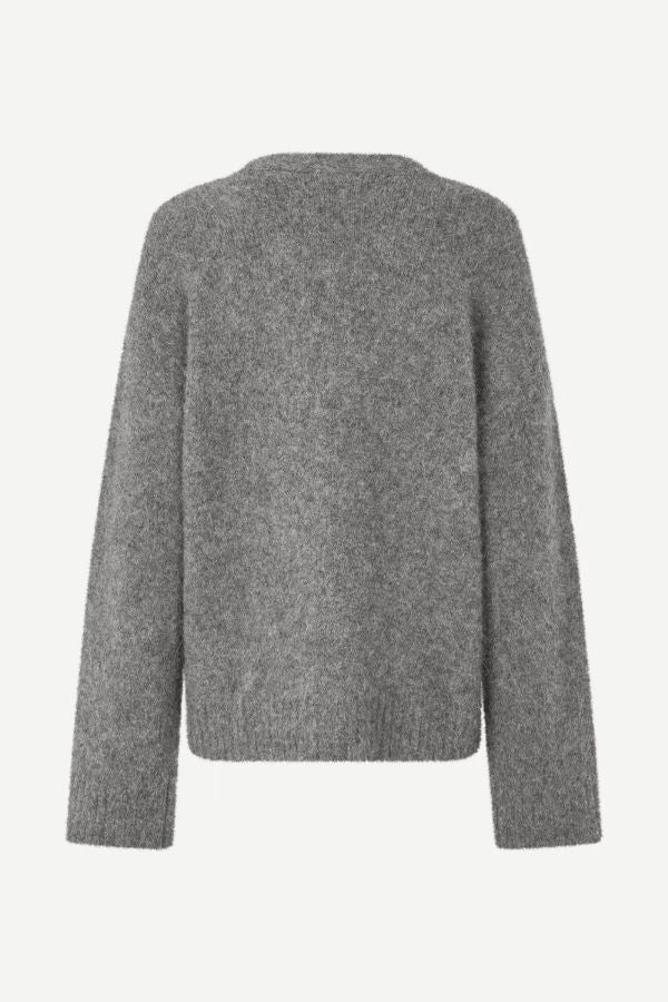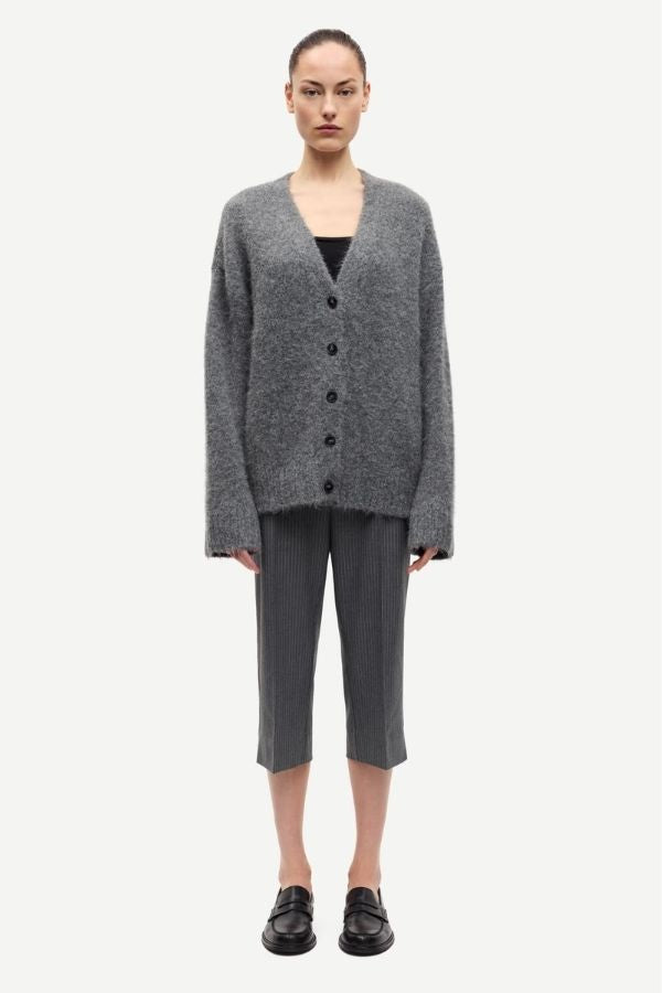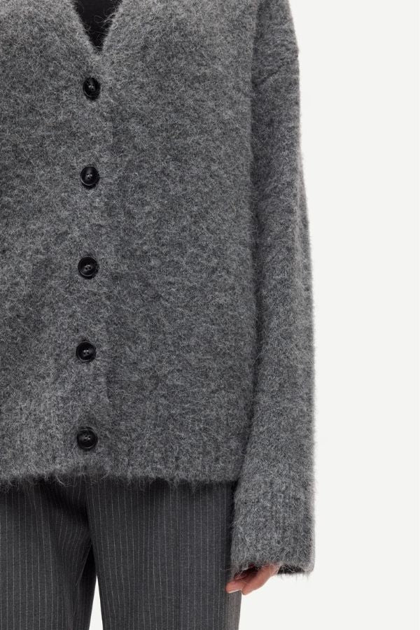 Knitted cardigan with a loose fit and dropped shoulders. Button closure on the front. Rib-knitted cuffs and hem. V-neck. Brushed look. Main material made from an elastic blend including alpaca wool.
