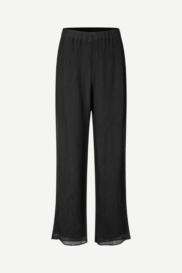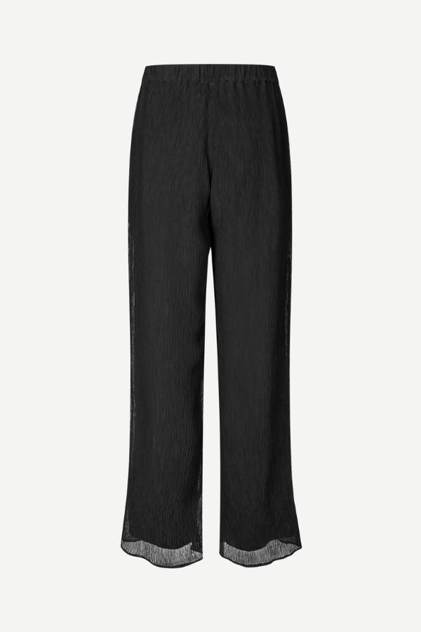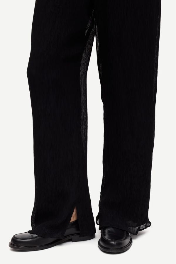 Mid-waist pants with a loose fit and flared leg. Elasticated waistband. Slits at the cuffs. Fully lined. Main material made from 100% recycled viscose.