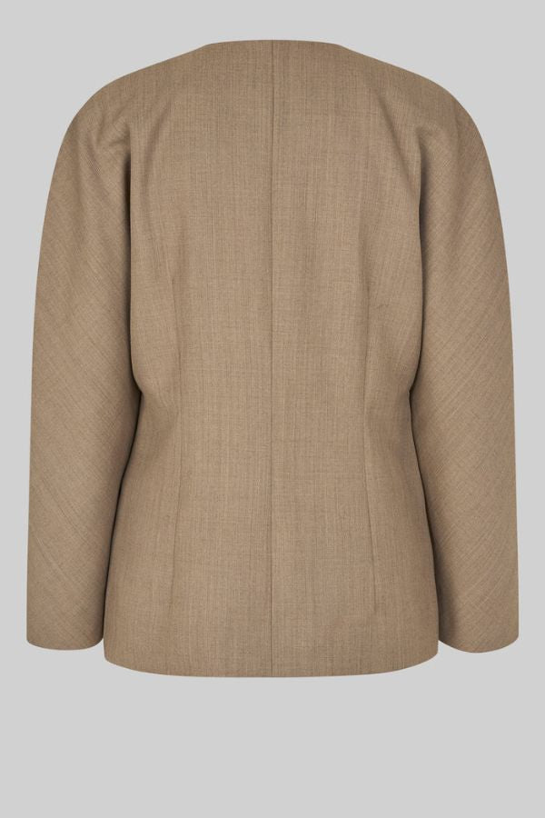 Second Female V-neck blazer. The blazer is made in a wool-blend fabric with melange quality. Featuring a V-neckline and single-button fastening. Rounded padded shoulders and long sleeves.