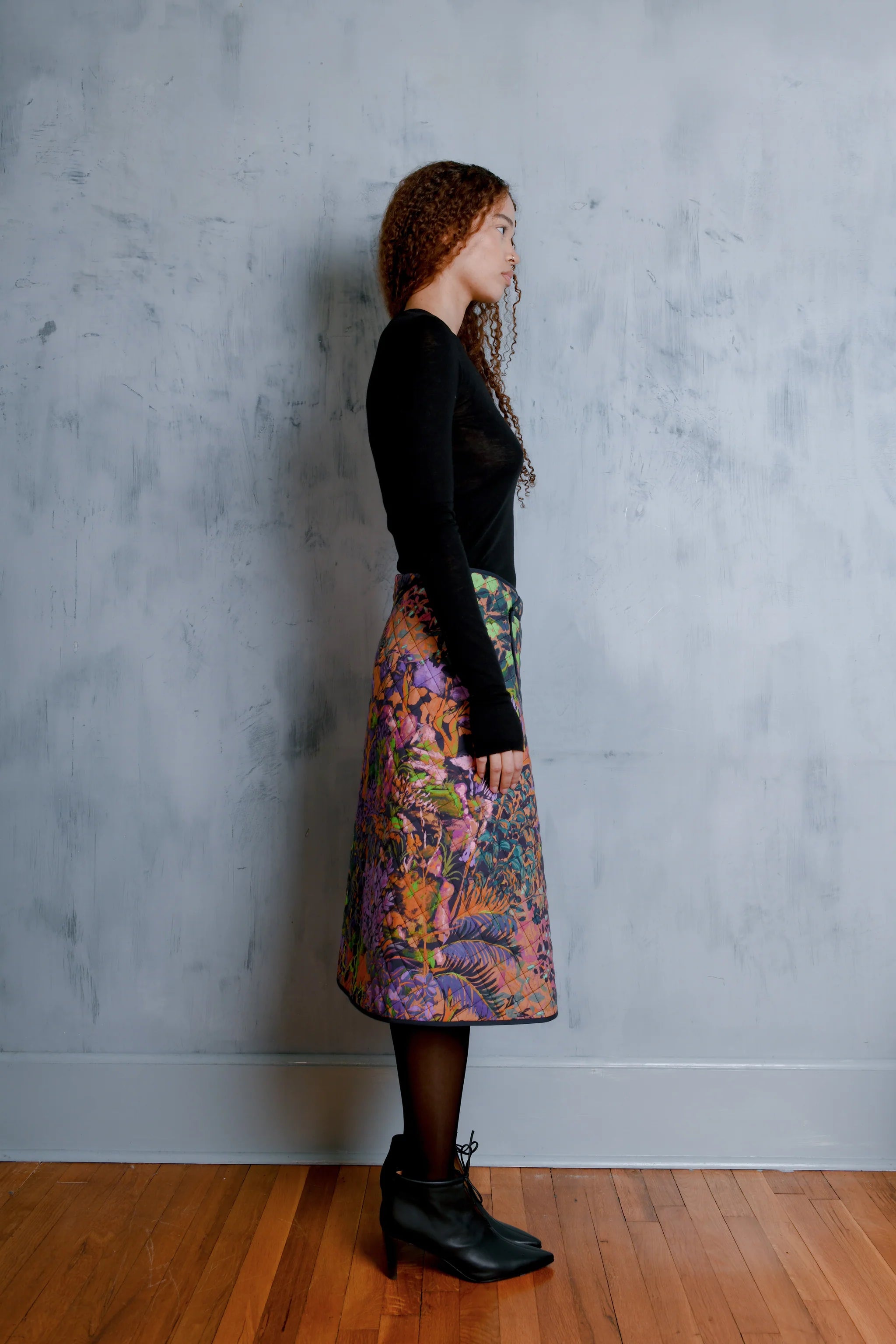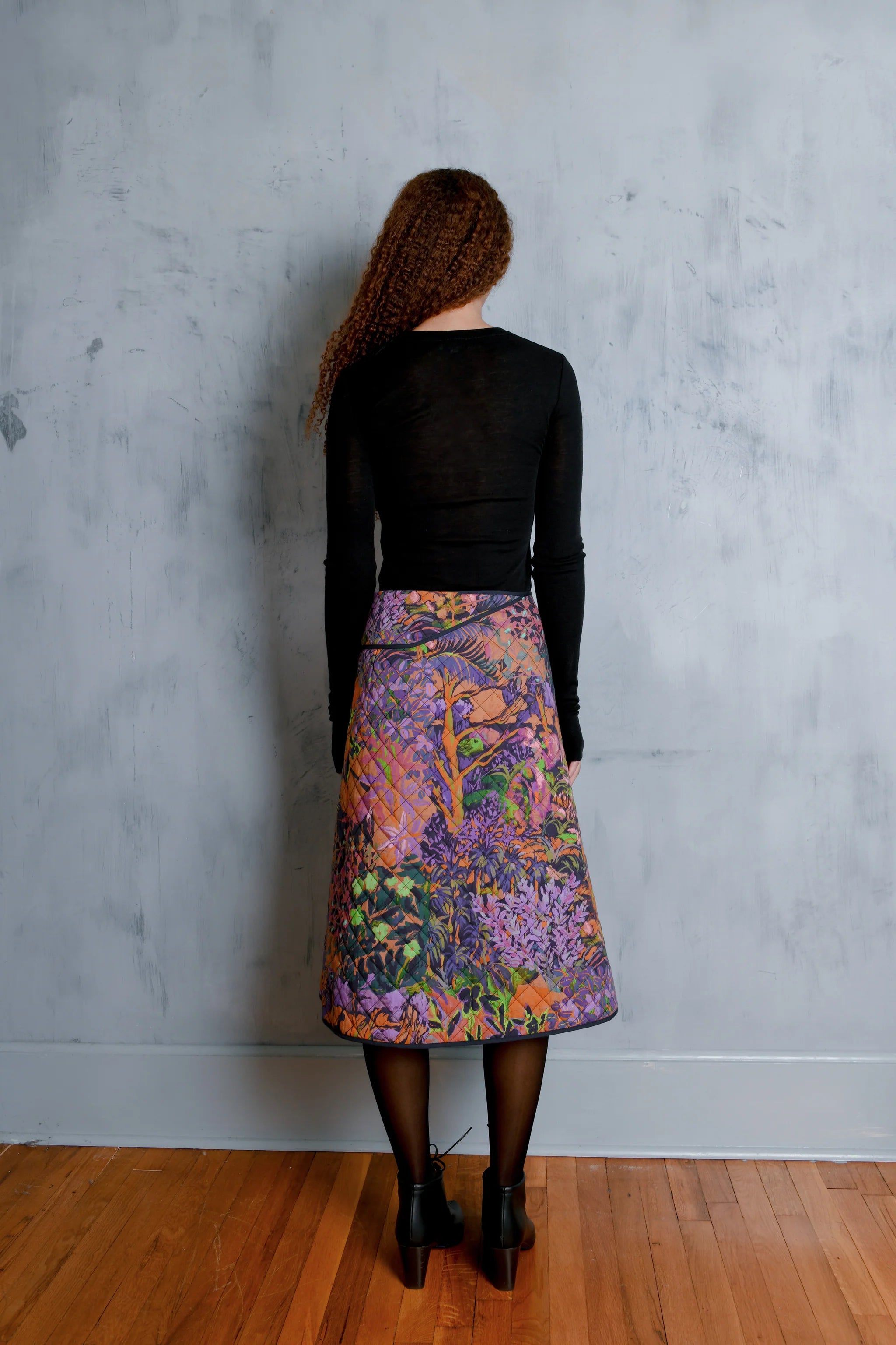 The Rose Skirt is a tailored A-line midi crafted from quilted cotton with natural batting, giving it soft structure and warmth. Featuring UIM custom hand painted artwork Horae, it has a wrap-style front, clean waistband, contrast-bound edges, and a secure snap closure. Pair it with a lightweight sweater or fitted blouse for a modern, polished look.
