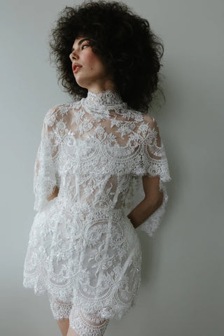 Not conforming to traditional bridal, we wanted to create a fun yet incredibly beautiful ceremonial collection for modern, adventurous, and fashion-forward brides. Inspired by magical eras, think fringing, intricate beading, lace blazer dresses, puff shoulders, and ruffles, all combined with luxurious natural fibres, liquid-like silks, and flattering body-skimming cuts.