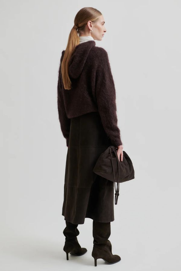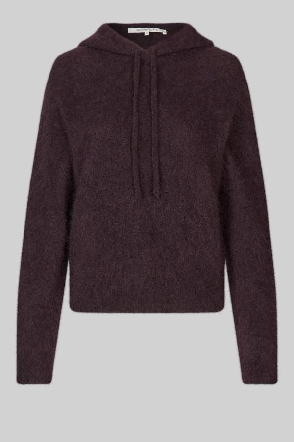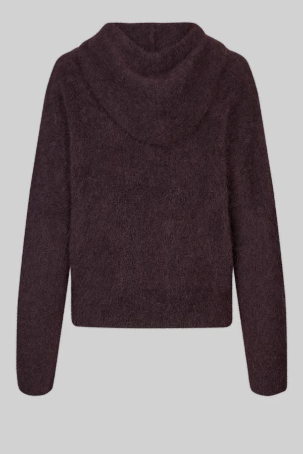 Second Female knitted hoodie. Made in a soft and stretchy mohair blend with slightly fluffy texture. Featuring a hood with drawstring tie and dropped shoulders with long sleeves.